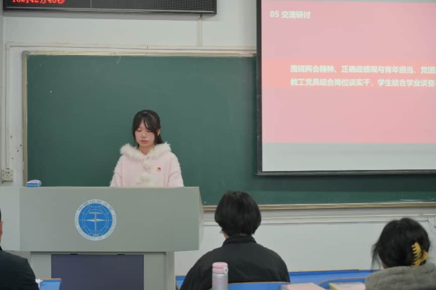 交流研讨环节,027242班副班长符馨尹同学结合全国两会精神与正确政绩观分享学习感悟,她表示,将以正确政绩观为指引,把“实干”二字融入学业,同时做好班级工作,以实际行动带动身边同学共同进步,用青春奋斗诠释青年担当。