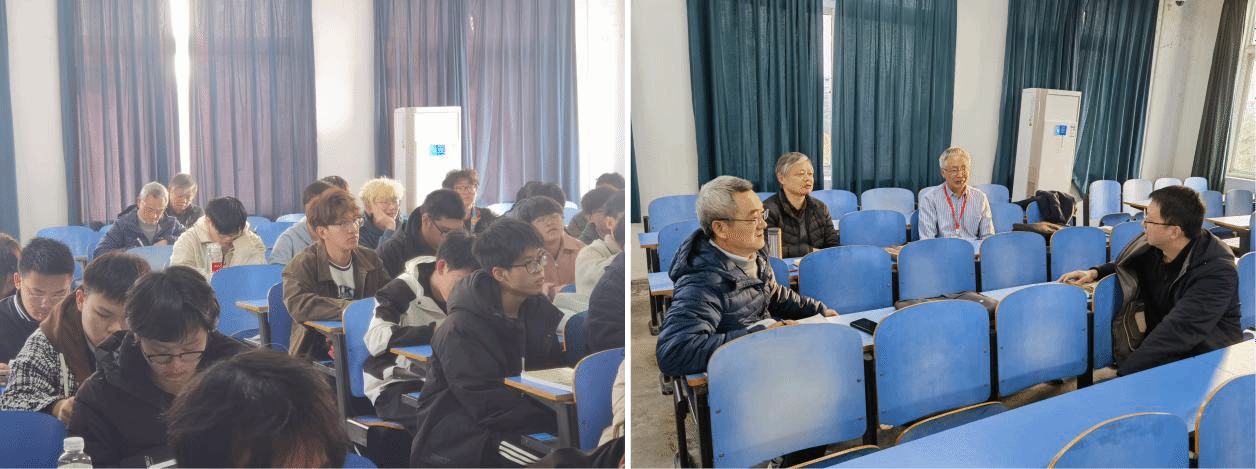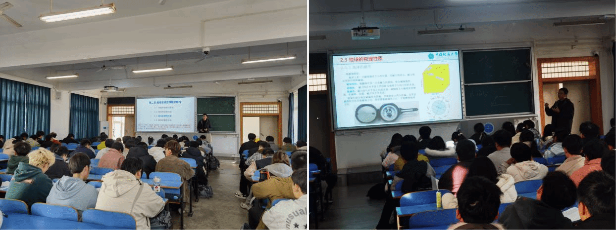 春季课程刚开始,资源学院石油地质系普通地质教学组积极探讨人工智能时代的普通地质教学内核。2026 年 3 月 9 日下午,梅廉夫教授、徐思煌教授与叶青副教授在教一楼 405 展开普通地质学现场教学研讨,叶青副教授给 02D254、02D255、 02D256 与 02D247 四个班共 85 人讲授了地球的物理性质与圈层结构。叶青副教授展示了较强的大课堂管理能力,课堂纪律好,学生认真听讲。课堂内容生动,从地球的磁场引申到野外地质教学实习的罗盘使用,从地球的重力场与弹性扩展到地球物理勘探。他强调地球的物理性质和圈层结构并不是看不见摸不着的抽象概念,它们与我们的日常生活密切相关。